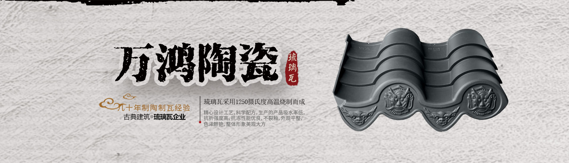 宜興市萬鴻陶瓷有限公司是國內(nèi)生產(chǎn)古建琉璃瓦企業(yè),也是宜興市琉璃瓦行業(yè)龍頭骨干企業(yè)。琉璃瓦采用1250攝氏度高溫?zé)贫桑咀浣?jīng)濟(jì)發(fā)達(dá)的宜興市丁山鎮(zhèn),臨近寧杭高速公路、新長鐵路、錫宜高速和104國道,交通十分便利。 萬鴻陶瓷擁有幾十...
